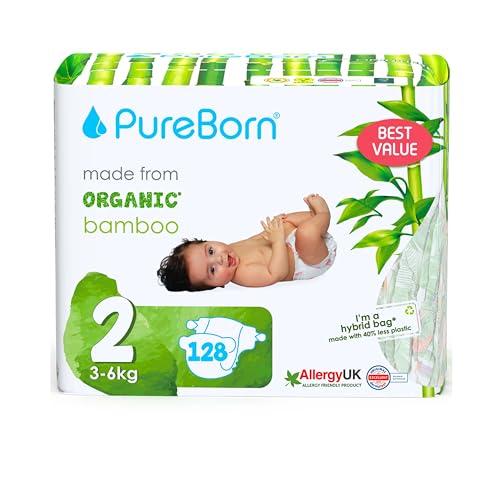 PureBorn Eco Bio-Bambus Windeln, Größe 2 (3-6 kg), 128 Stück, Umweltfreundlich, Hypoallergen, Ultraweich, mit Nässeindikator, Diverser AufdruckGröße 2 stinf €